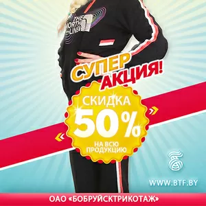 Уважаемые покупатели! Спешим напомнить о том, что с 7 ноября по 30 ноября в фирменном магазине «Фристайл» (г. Бобруйск, ул. Первомайская, 40) проводится СуперАкция – скидка до 50% на всю продукцию торговой марки «Бобруйсктрикотаж». У нас Вы можете найти широкий выбор мужской, женской и детской одежды и трикотажных изделий для дома, отдыха и спорта.